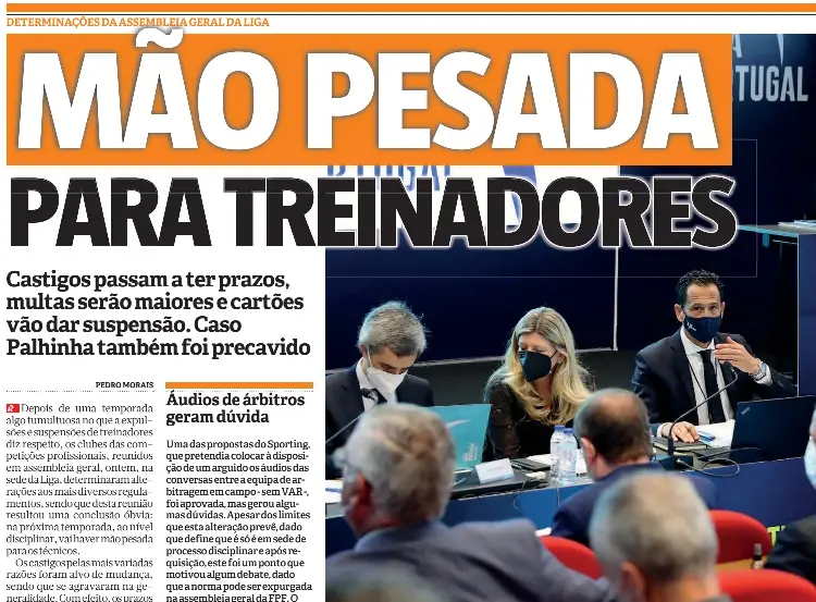 çDepois de uma temporada algo tumultuosa no que a expulsões e suspensões de treinadores diz respeito, os clubes das competições profissionais, reunidos em assembleia geral, ontem, na sede da Liga, determinaram alterações aos mais diversos regulamentos, sendo que desta reunião resultou uma conclusão óbvia: na próxima temporada, ao nível disciplinar, vai haver mão pesada para os técnicos. Os castigos pelas mais variadas razões foram alvo de mudança, sendo que se agravaram na generalidade. Com efeito, os prazos das punições duplicaram e os valores das multas passam a ser ainda mais acentuados. Quer isto dizer que, em casos de ofensa à honra e reputação, atrasos no início e reinício dos encontros e atrasos e faltas de comparências às flash interviews, os treinadores passarão a ser penalizados de forma muito mais dura, um ponto que foi aprovado por todos os clubes presentes. Mas as novas regras não ficam por aqui. Isto porque, se for expulso em jogo por protestos, um treinador será obrigado a cumprir um jogo de suspensão - ponto que teve o voto contra do FC Porto -, sendo o mesmo válido para quando atingir uma série cumulativa de amarelos, à semelhança do que acontece com os jogadores. Até aqui não havia castigo por acumulação de amarelos nem suspensão automática após uma expulsão por protesto simples, sem ser por lesão da honra e reputação; só ao cabo de três, com as penas a serem agravadas por questões de reincidência. No fundo, os técnicos correm agora mais risco de serem penalizados. Ainda em relação aos treinadores, foi também aprovada uma norma transitória para quem está a frequentar o nível IV de treinador. Até então, quem estivesse a realizar o curso podia ser inscrito como treinador principal e essa disposição manter-se-á por mais seis meses, antes de ser revogada a partir de janeiro próximo, dando-se assim tempo a quem está a frequentar o curso para o concluir, caso, por exemplo, de Rúben Amorim. Outra questão que motivou também alterações ao Regulamento Disciplinar foi a necessidade de precaver um novo caso Palhinha, um dos episódios que mais polémica gerou na temporada passada. Os clubes decidiram que jogadores com o castigo de 5º amarelo suspenso por intermédio de recurso passarão agora a cumprir a pena no cartão seguinte. Quer isto dizer que, se fosse na temporada que se avizinha, Palhinha teria sido castigado ao 6º amarelo. Esta medida tem como intenção impedir que se acumulem amarelos sem que haja qualquer consequência. De notar que todas estas decisões, por interferirem com o Regulamento Disciplinar, terão de ser ratificadas numa posterior assembleia geral da FPF, pelo que, para todos os efeitos formais, ainda não podem ser dadas como definitivas. *